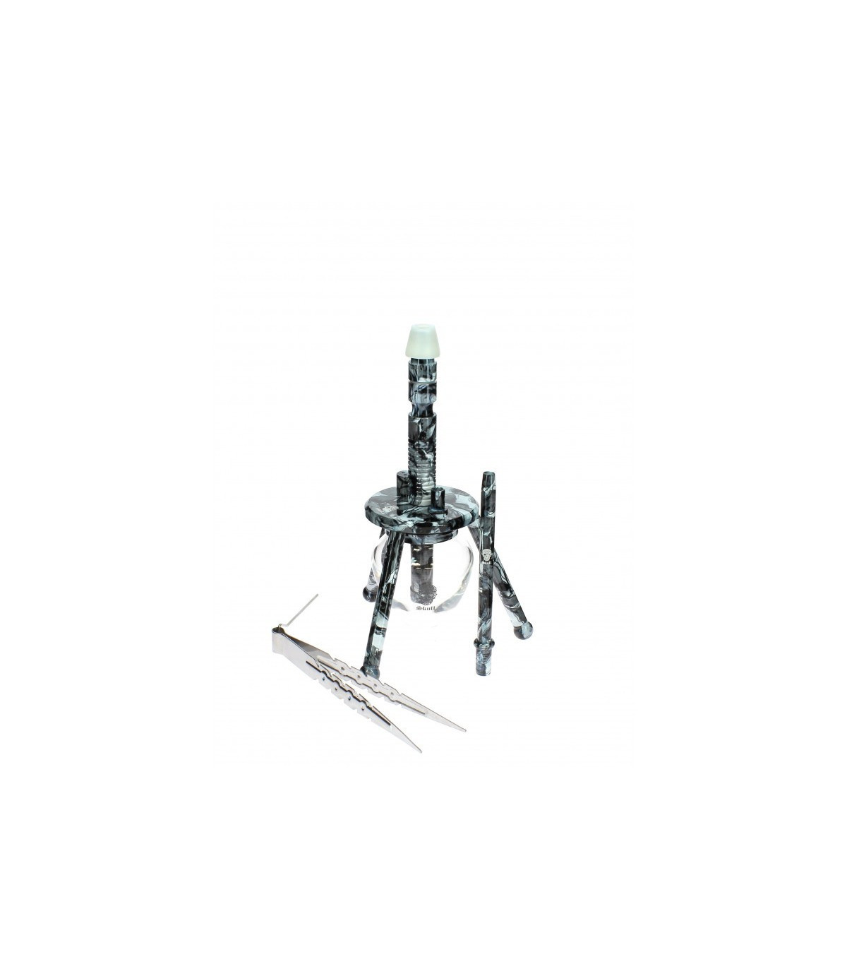 Nueva cachimba de la marca francesa SKULL , nos presenta su modelo xs con solo 28cm de altura y su estética similar a su modelo superior Cuenta con base de cristal y sistema de cierre a rosca además de cámara de estilo tradicional y difusor desmontable La cachimba incluye Manguera de silicona con boquilla de aluminio Pinzas Mochila de transporte
